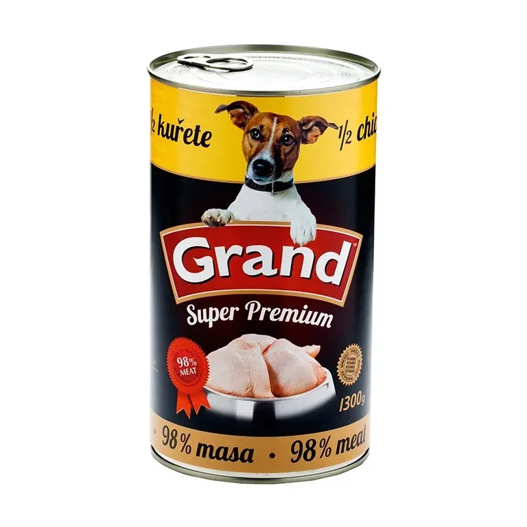 Konzerva Grand premium 1/2 celého kuřete je kompletní, prémiové krmivo pro psy, vytvořeno z čerstvého masa bez chemických přísad. Obsahuje vysoký podíl vitamínů a aminokyselin v přírodní formě. Neobsahuje žádné chemické ani konzervační přísady. Neobsahuje sóju. Do konzerv je přidávána rýžová mouka v maximální míře 0-2 % z důvodu zahuštění masové složky.